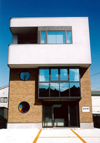 素敵な3階建て、丸窓のステンドグラスもおしゃれ。駐車場はスペースの広い6台
