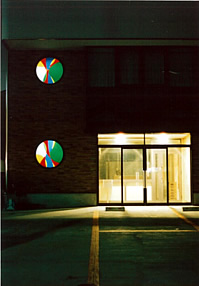 夜、内側にライトが点灯しステンドグラスが映える。1Fと2Fの丸窓が対をなしています。