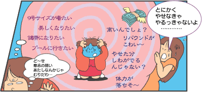 では、やせられる方はどのような方かと申しますと、意志の強弱ではなく考え方−プラス思考−の差、つまり自分を大切にしているか、いないかの差なのです。